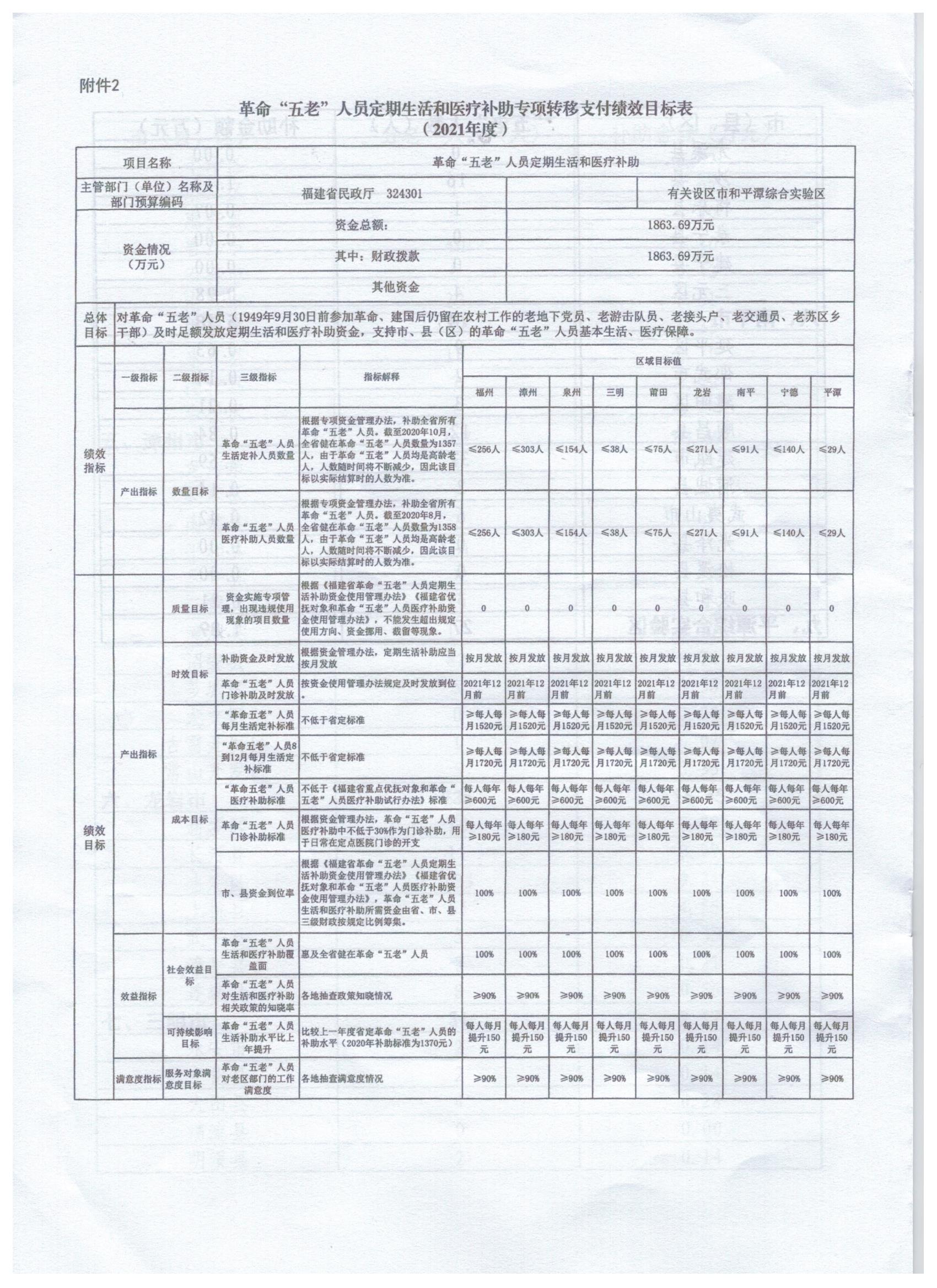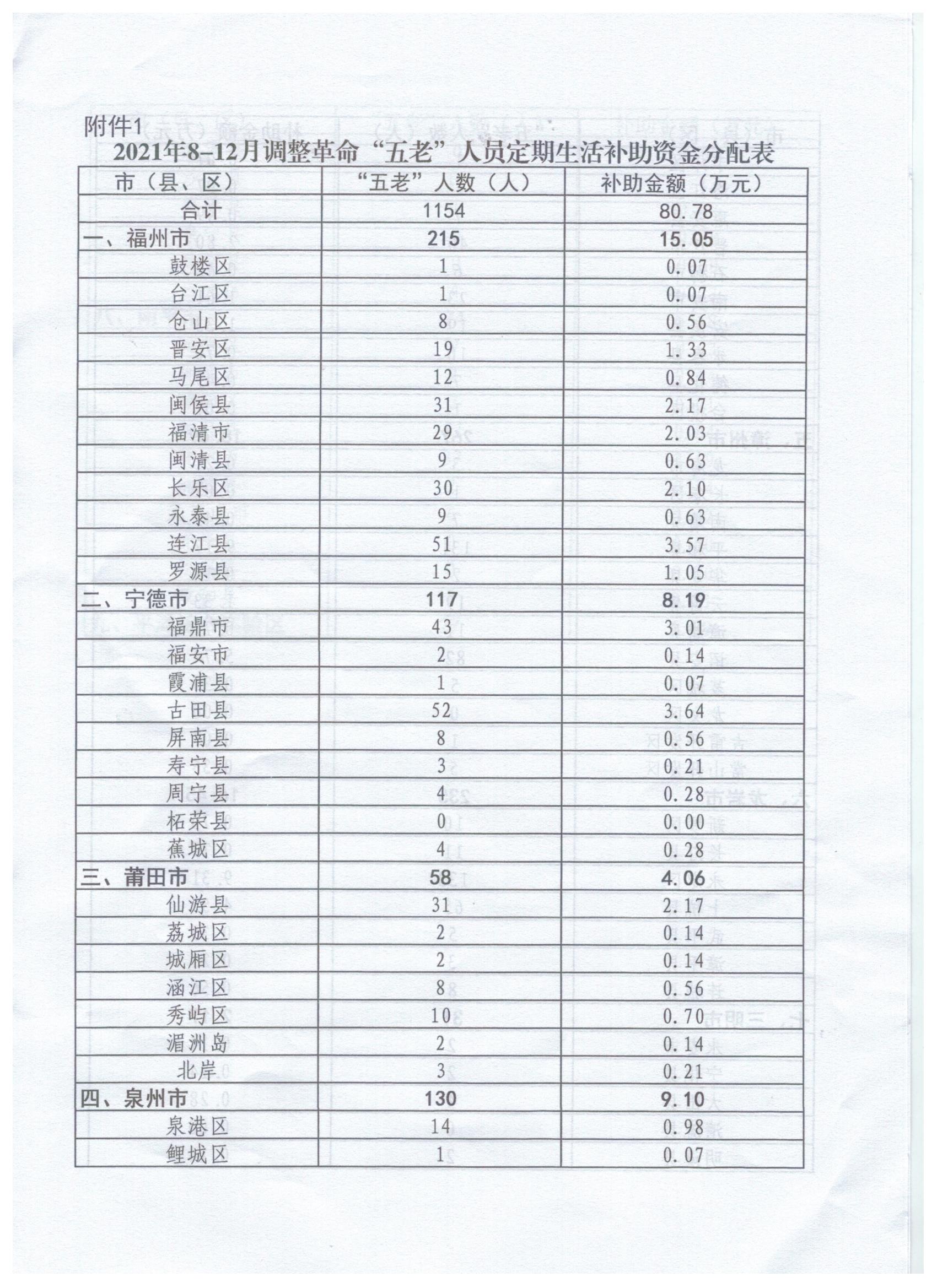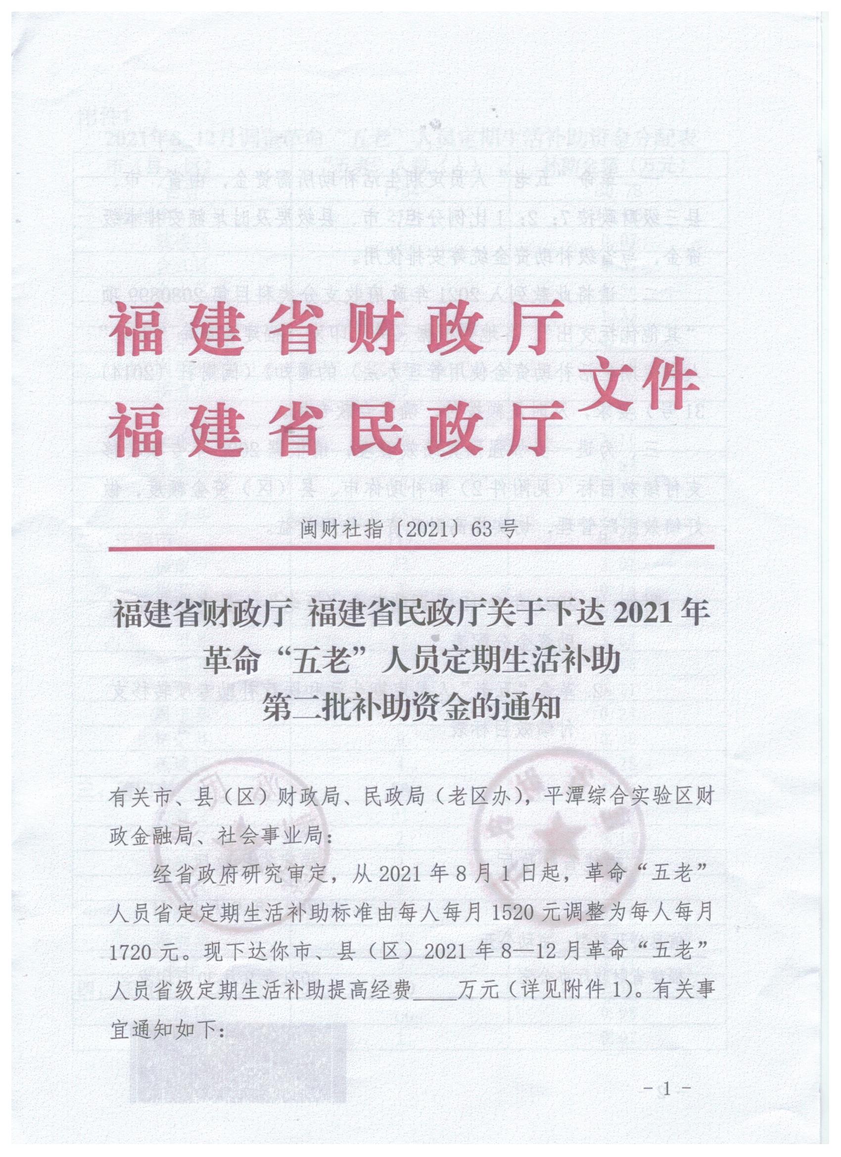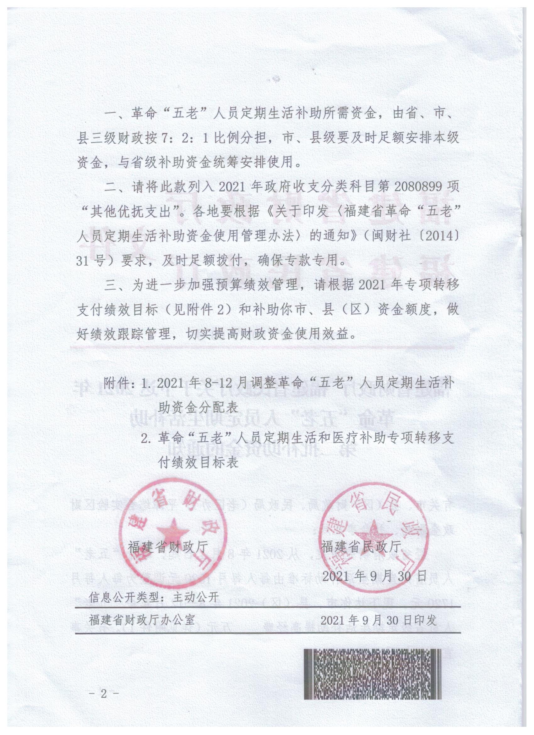 福建省财政厅 福建省民政厅关于下达2021年革命“五老”人员定期生活补助第二批补助资金的通知