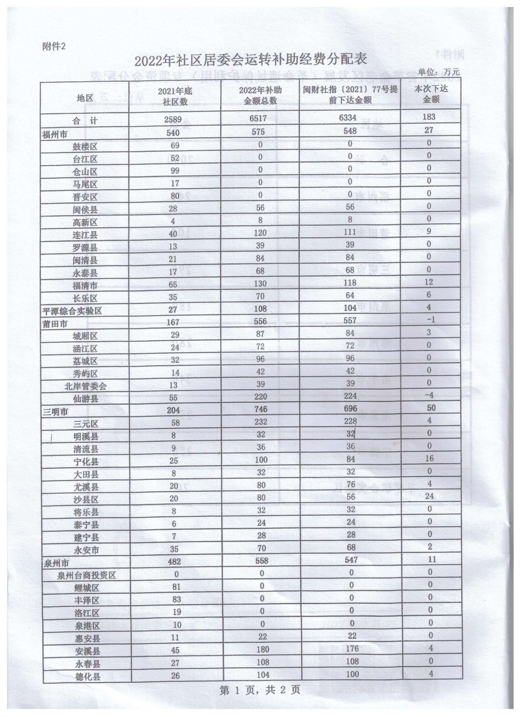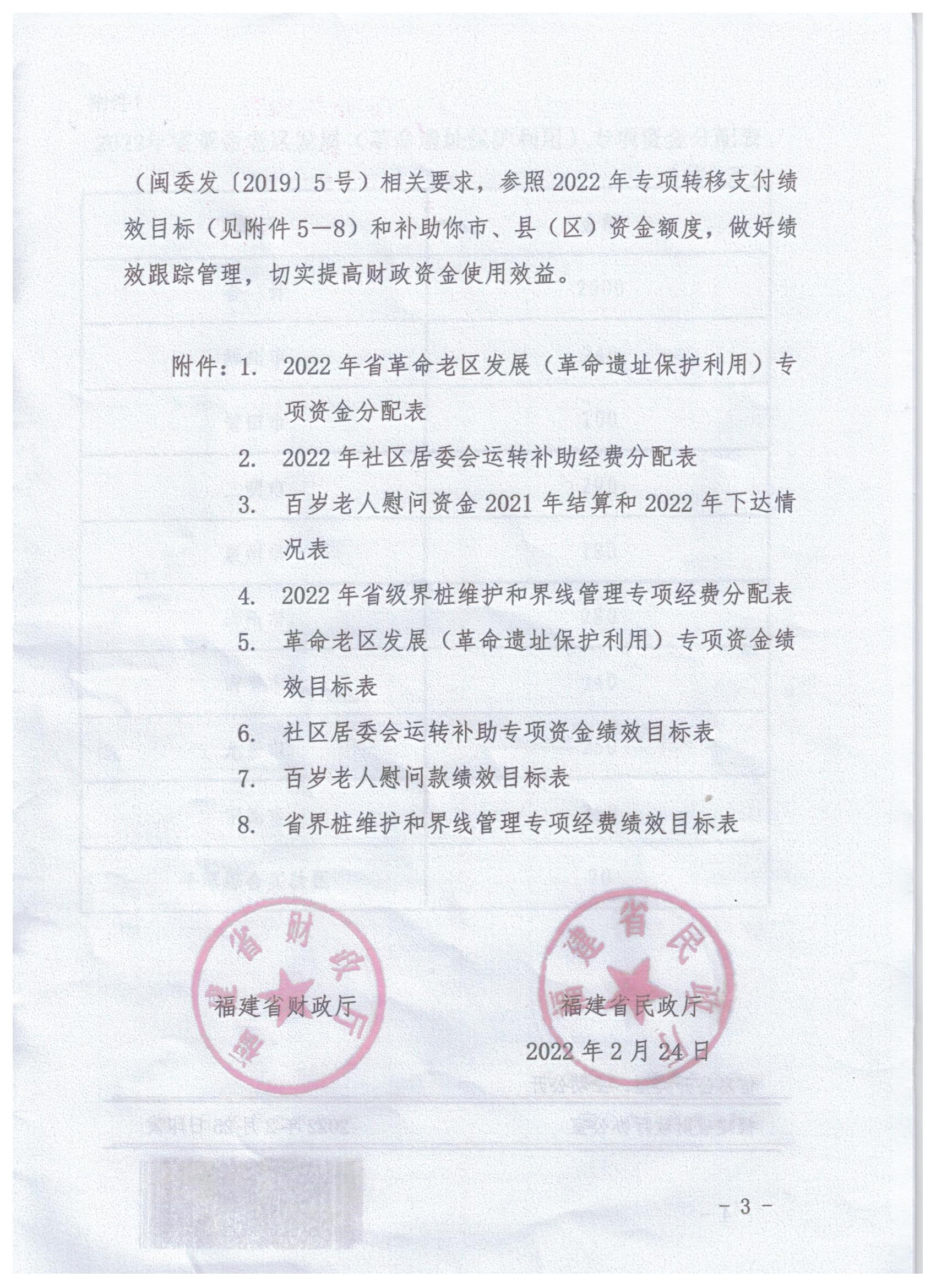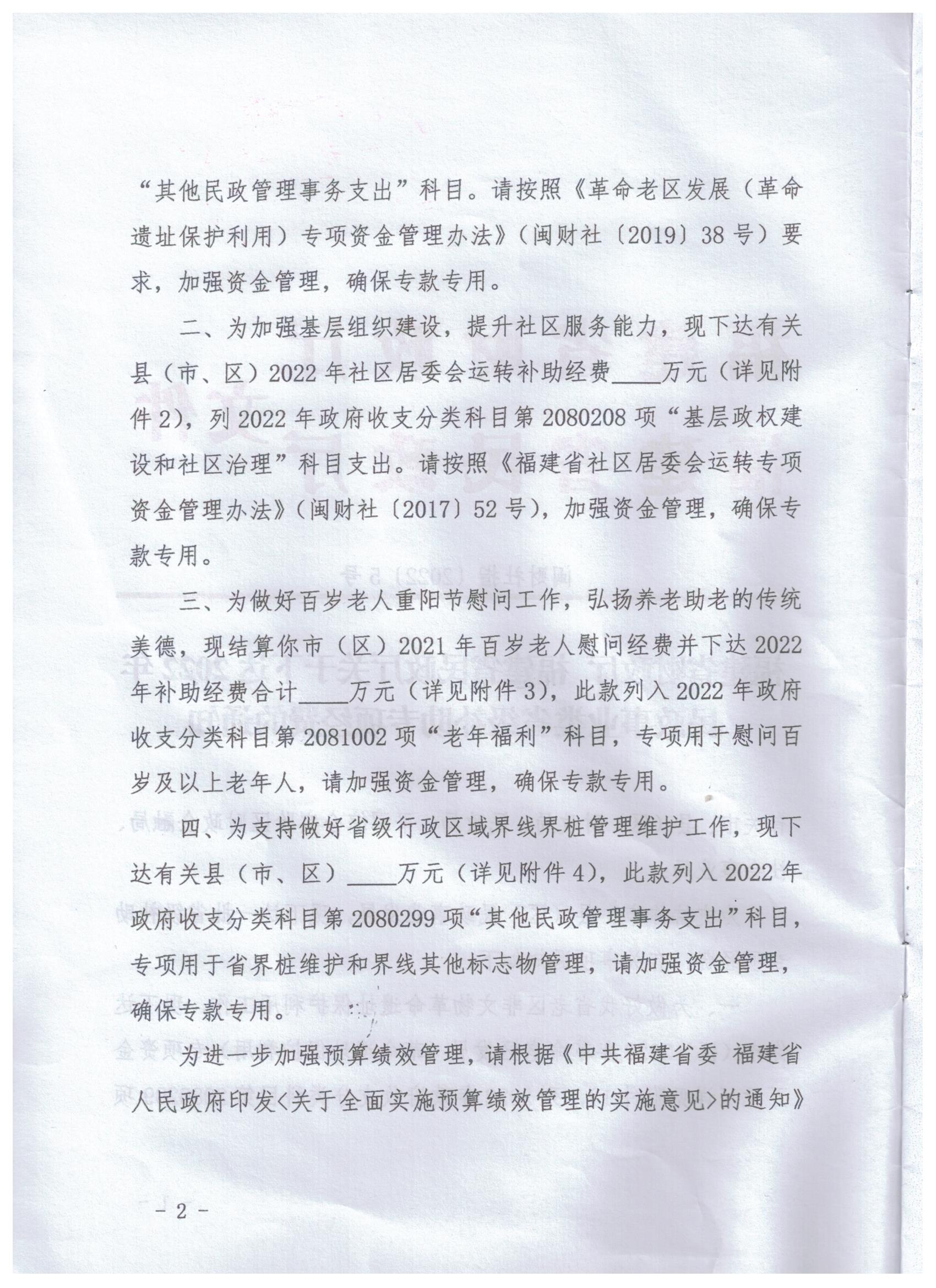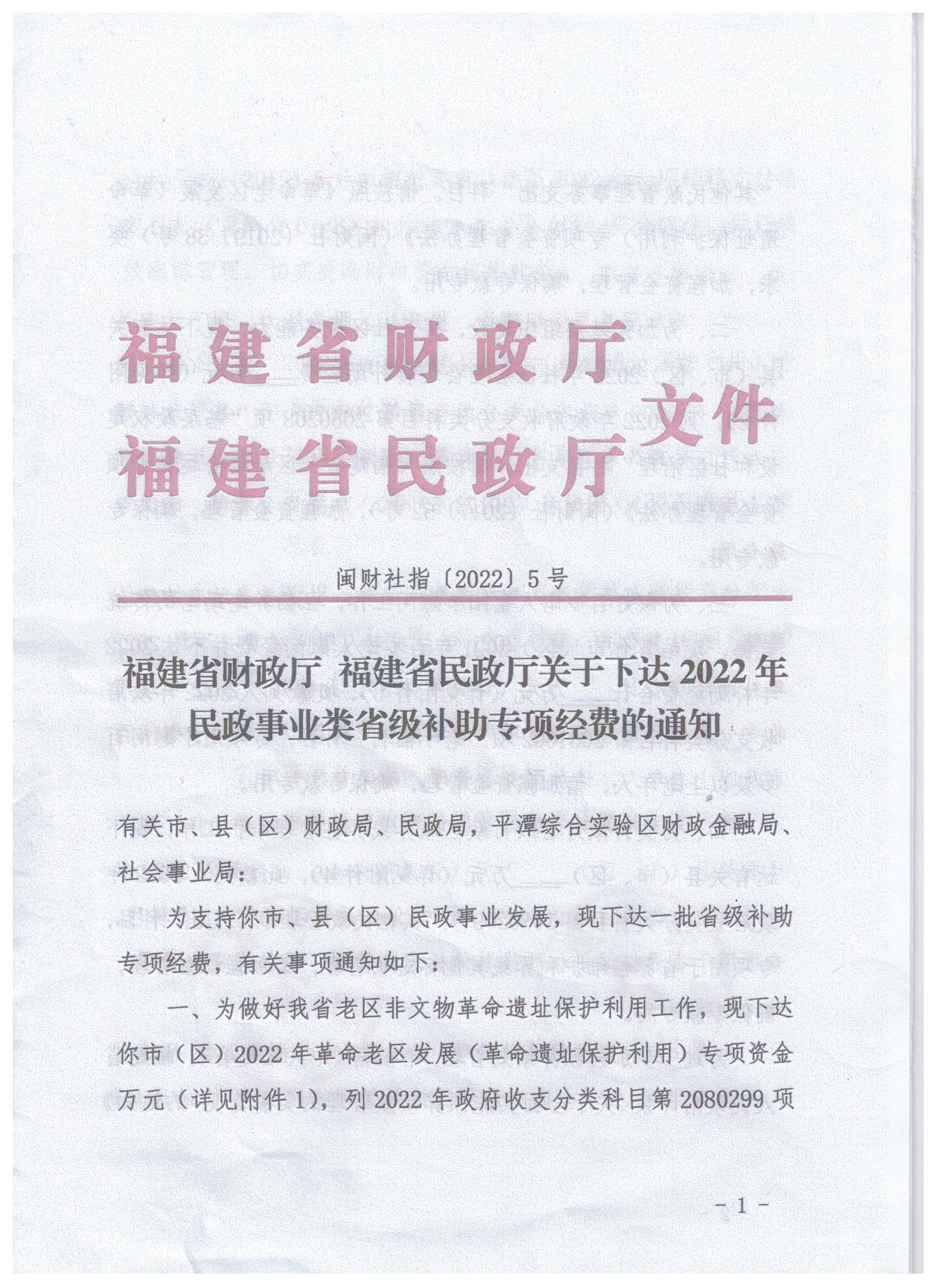 福建省财政厅 福建省民政厅关于下达2022年民政事业类省级补助专项经费的通知