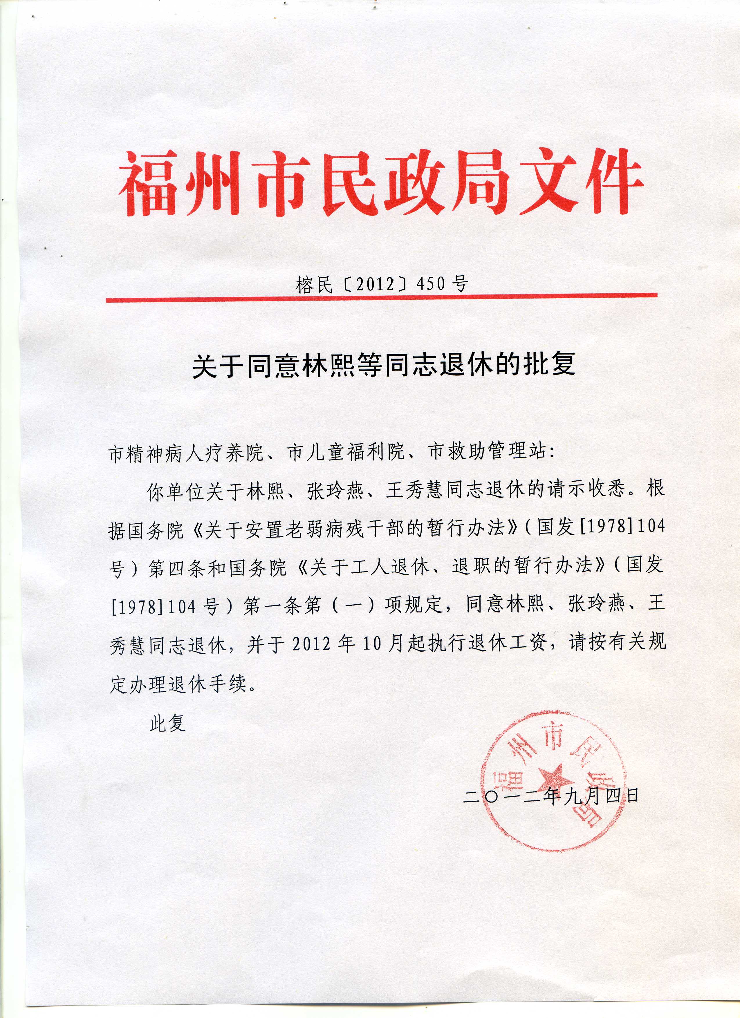 关于同意林熙等同志退休的批复