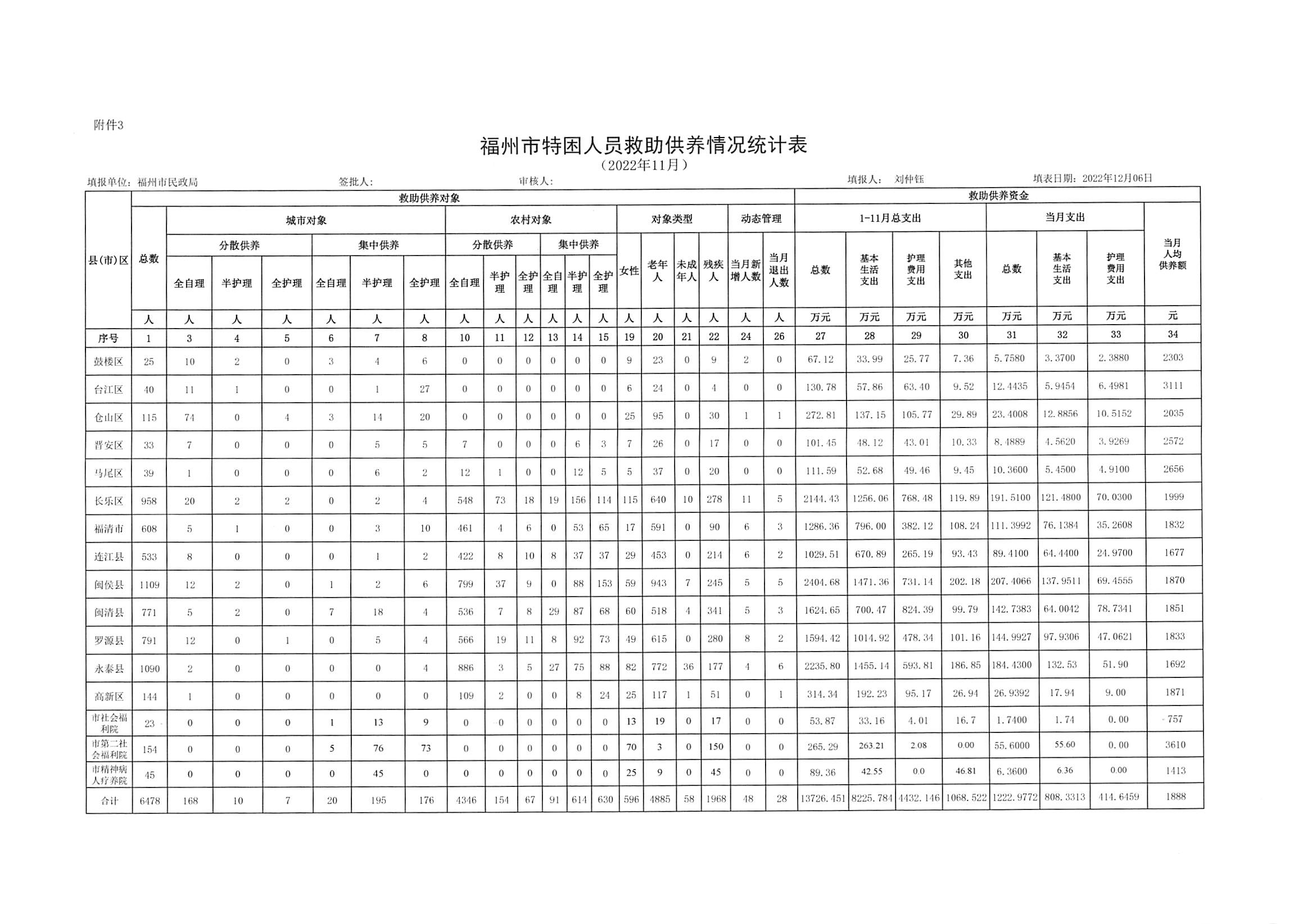 2022年三级色情 特困人员救助供养情况统计表(11月)