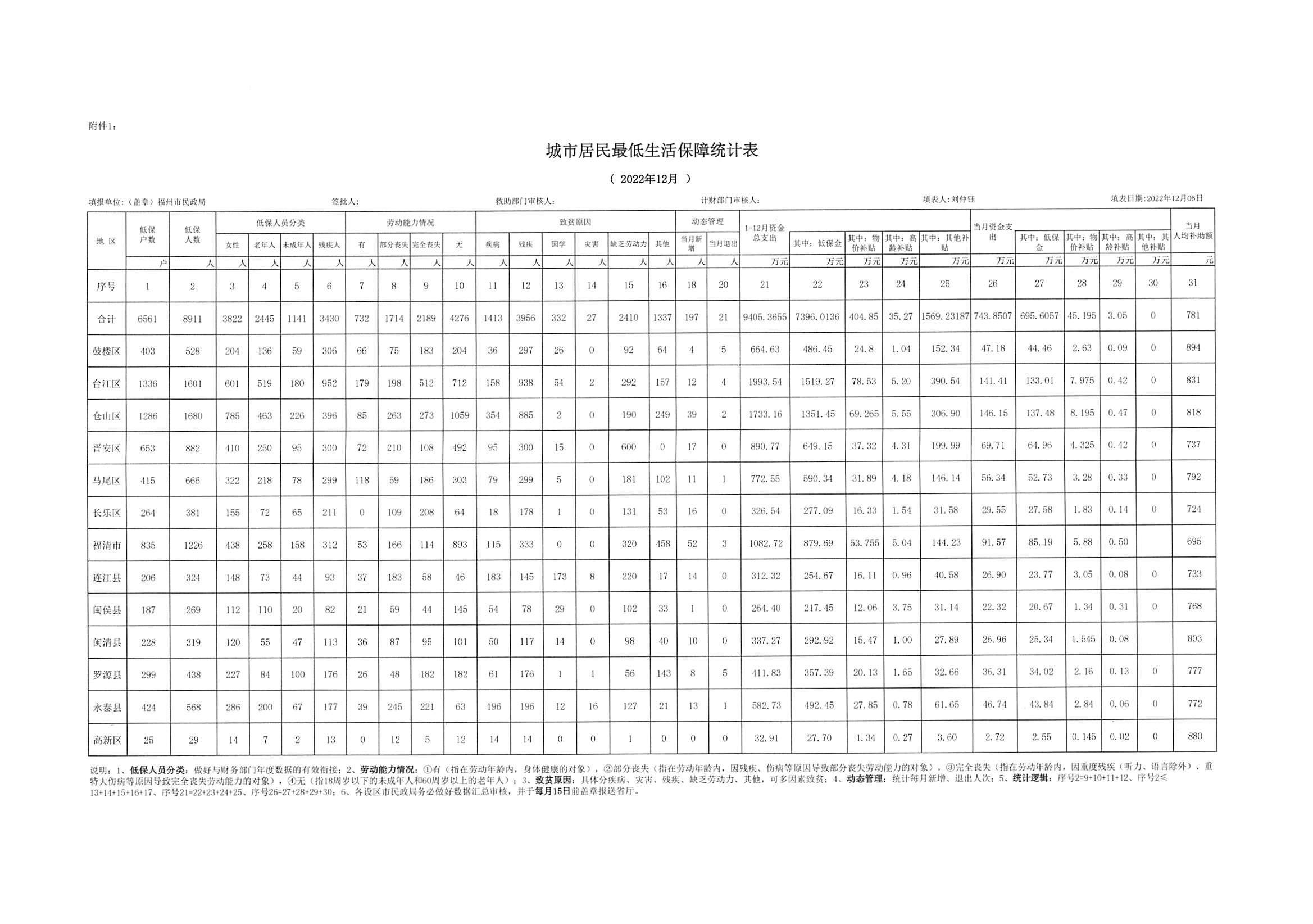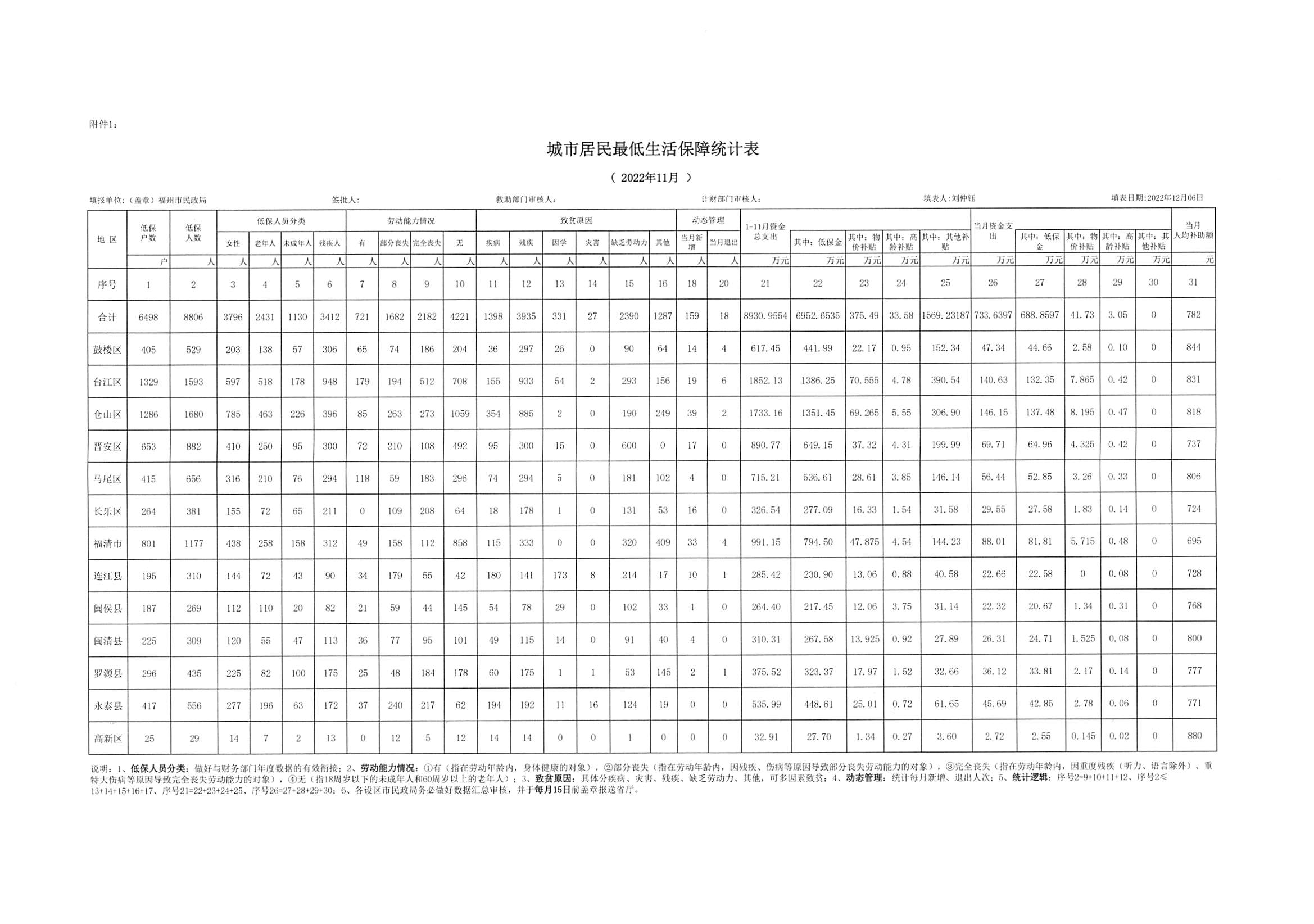 2022年三级色情 城市居民最低生活保障统计表(11月-12月)