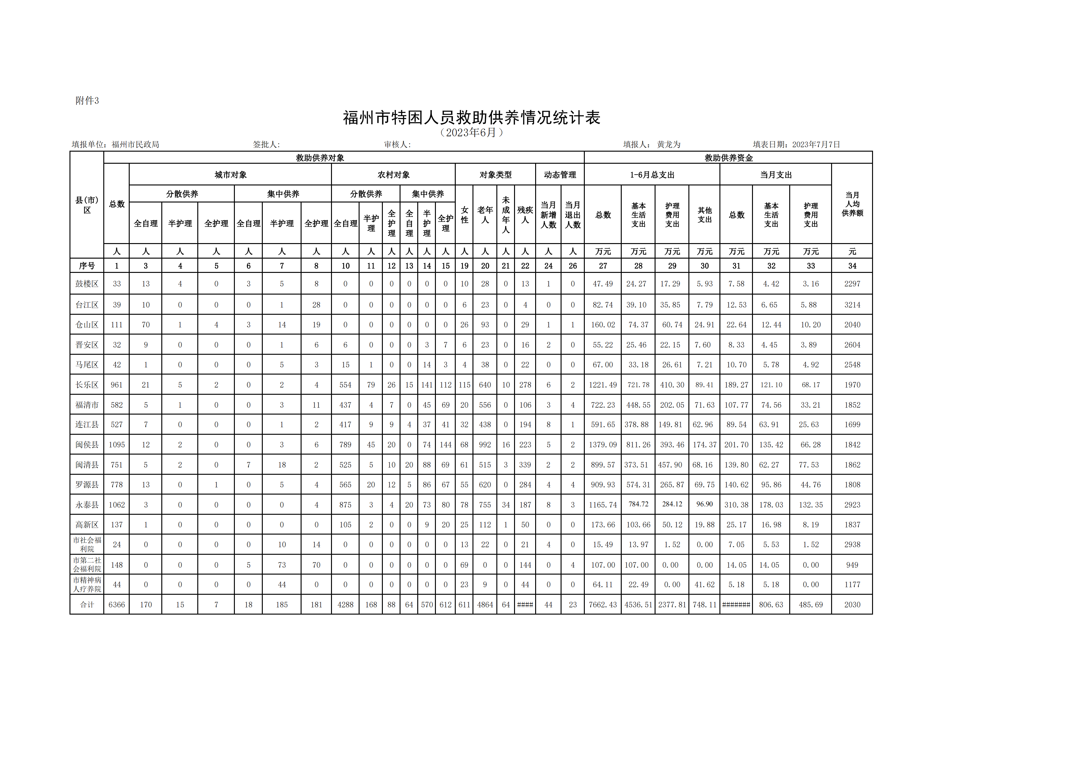 2023年三级色情 特困人员救助供养情况统计表(6月)