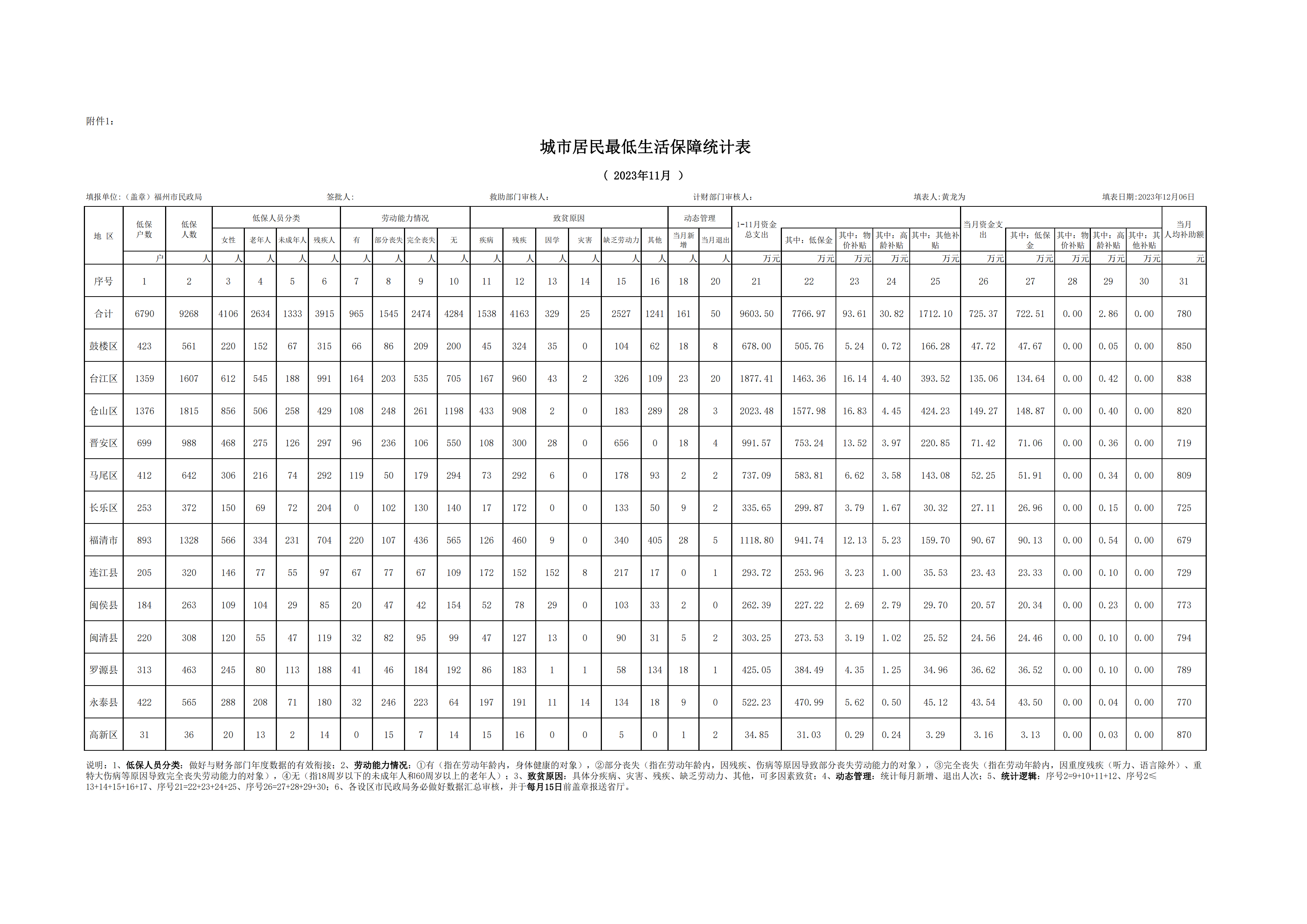2023年三级色情 城市居民最低生活保障统计表(11月)